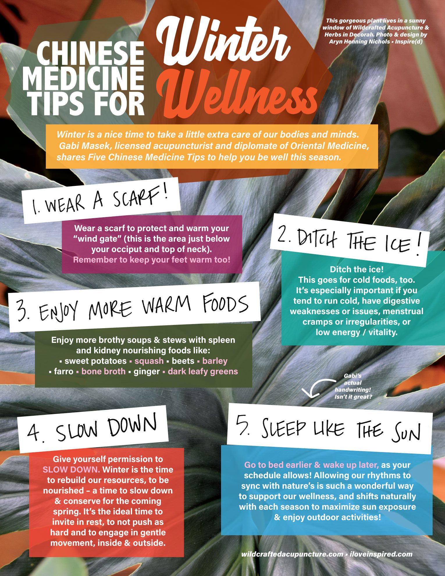 Gabi Masek, licensed acupuncturist and diplomate of Oriental Medicine* at Wildcrafted Acupuncture and Herbs in Decorah, Iowa, was kind enough to make a list of ideas and tips for fostering wellness in the winter.